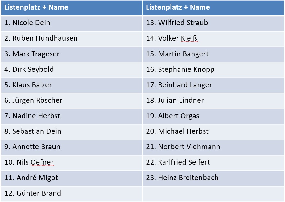 Unsere am 27.11.2025 in der Mitgliederversammlung beschlossene Kandidatinnen- und Kandidatenliste für die Wahl der Gemeindevertretung im Rahmen der Kommunalwahl am 15. März 2026: